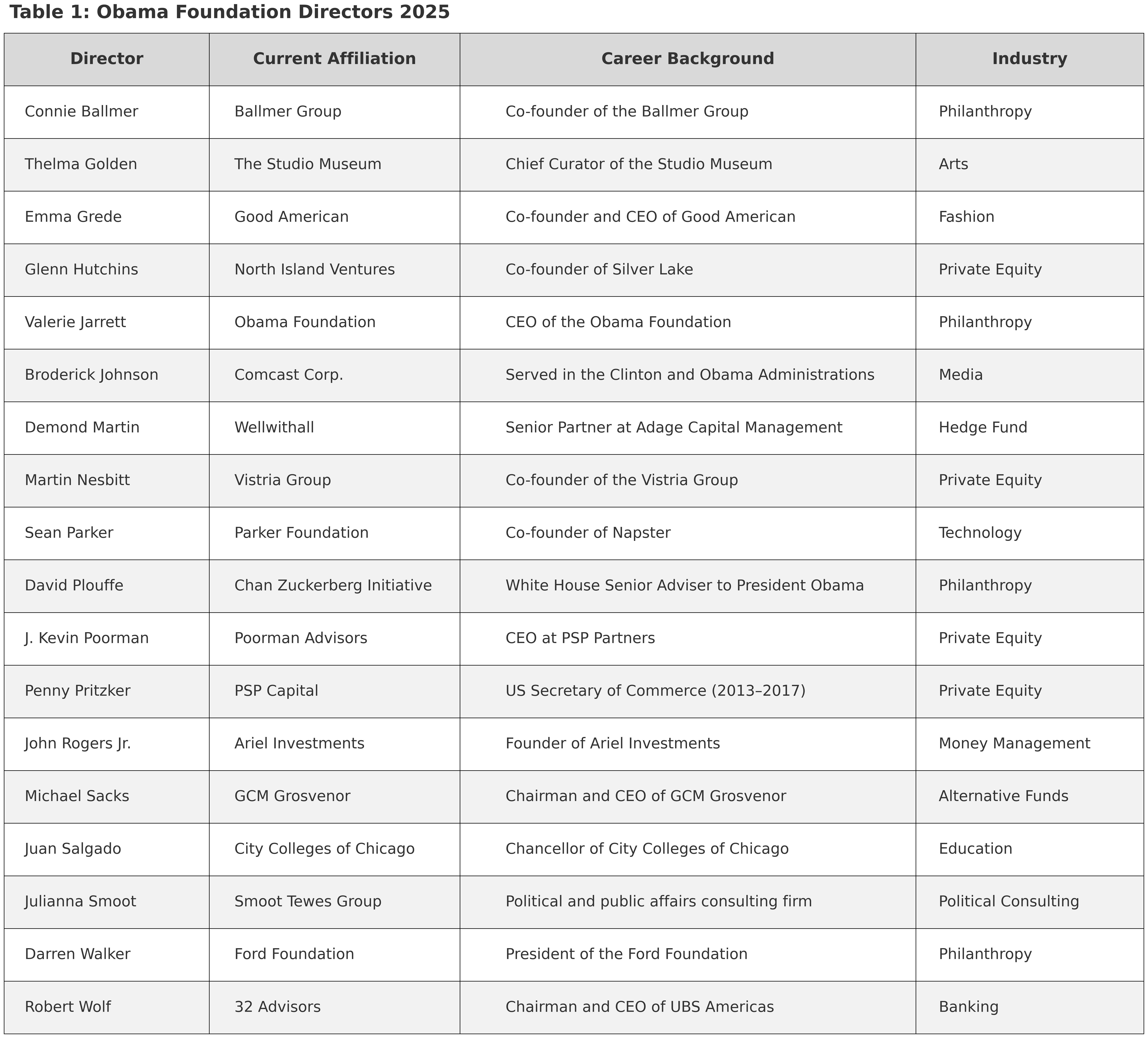 The Barack Obama Foundation, created to finance and build a presidential library for the former commander-in-chief, arranged for its Wall Street-heavy board of directors to potentially help shoulder the project’s $850 million price tag.